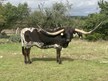 We purchased her from G & P Longhorns in 2021. She is out of the the 100" TTT Cut'N Dried, who brings in the 108' Cowboy Tuff Chex and 101" BL Rio Catchit. She has produced 3 straight true black calves!