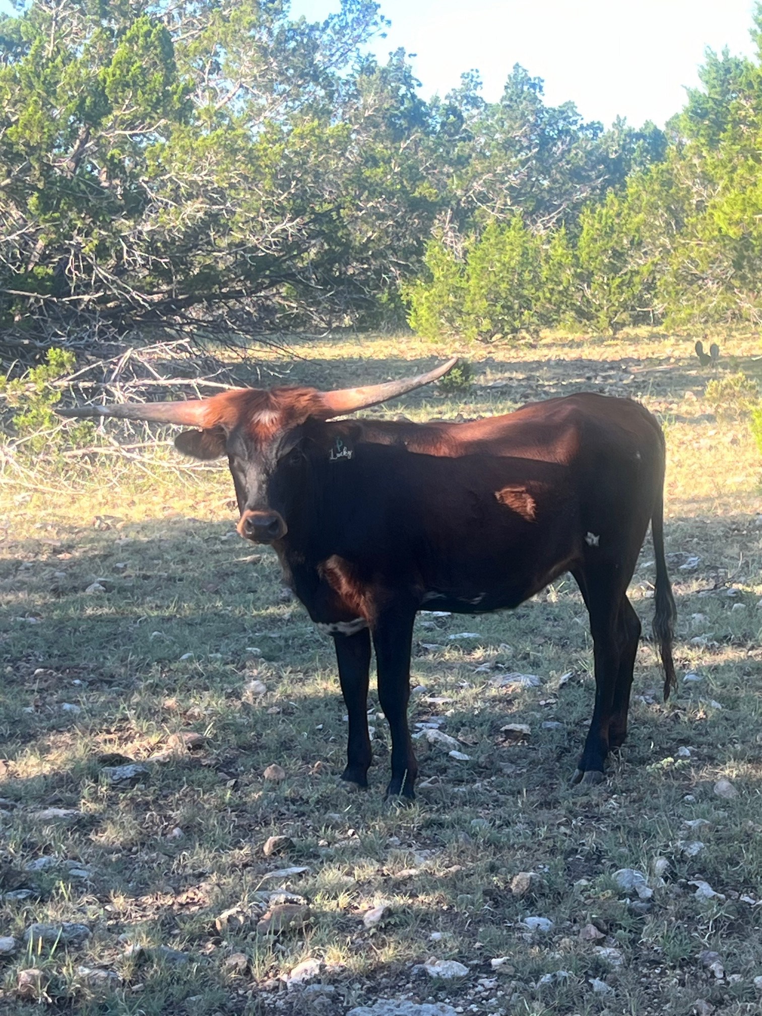 Twisty horn, a dark red wine color, and a royal pedigree. Exposed to our young true black & white bull, M7 Hydro's Thunder, for a Fall 2025 calf!