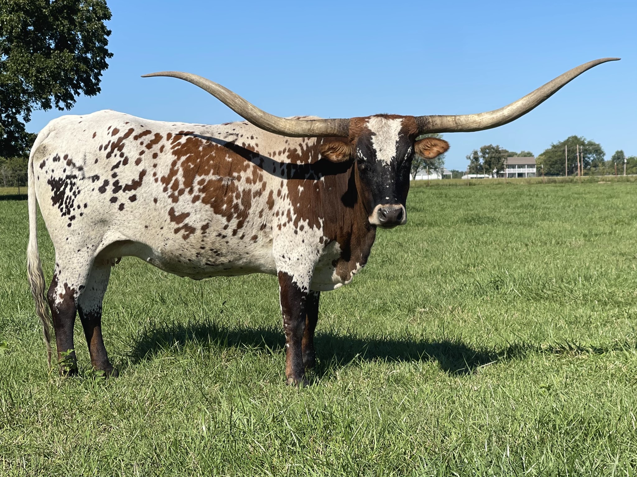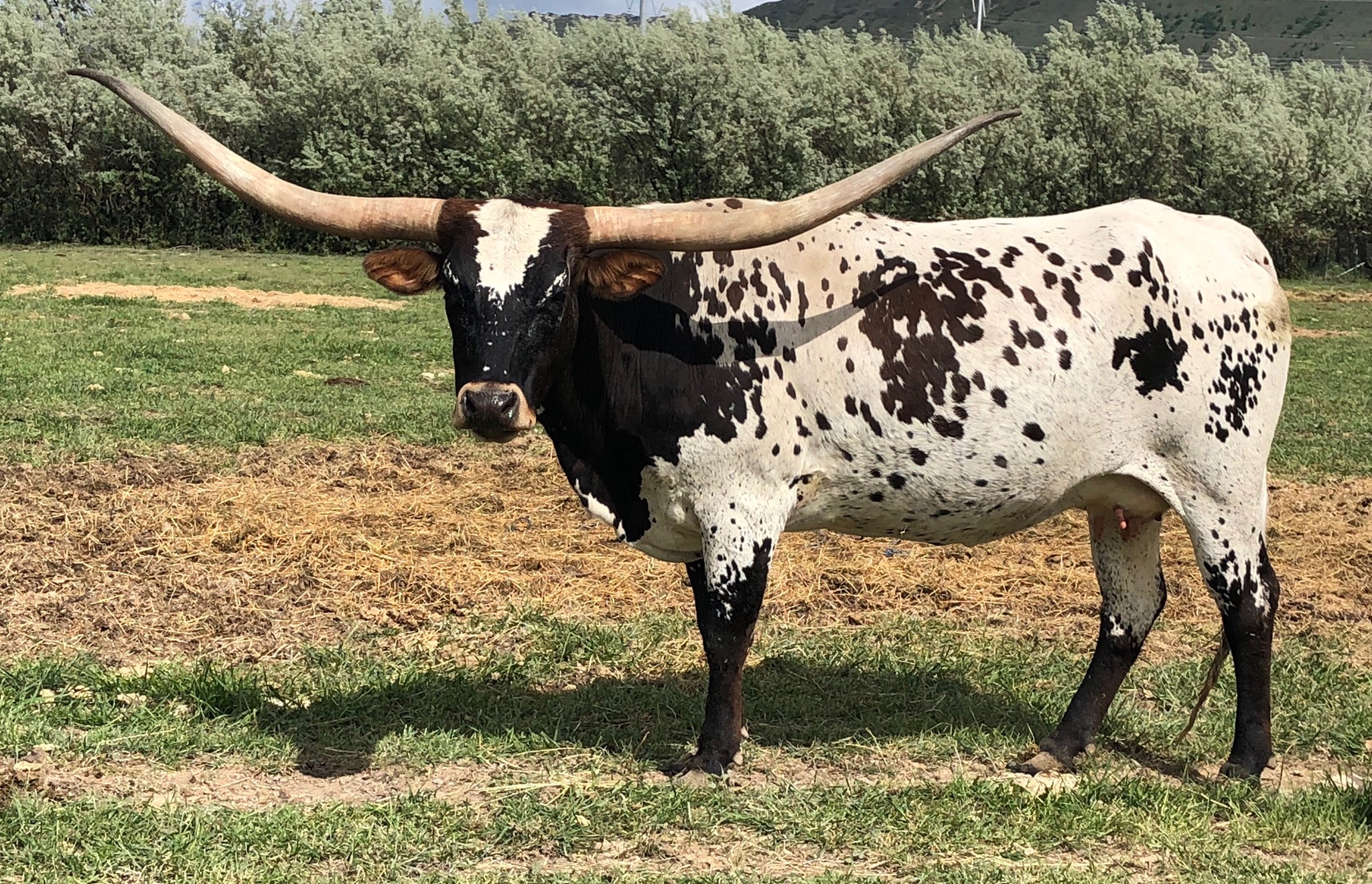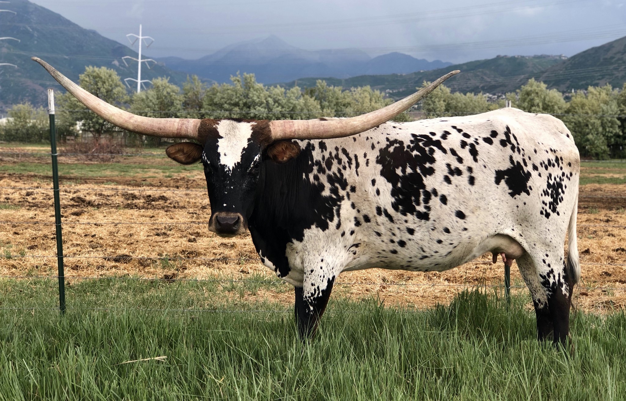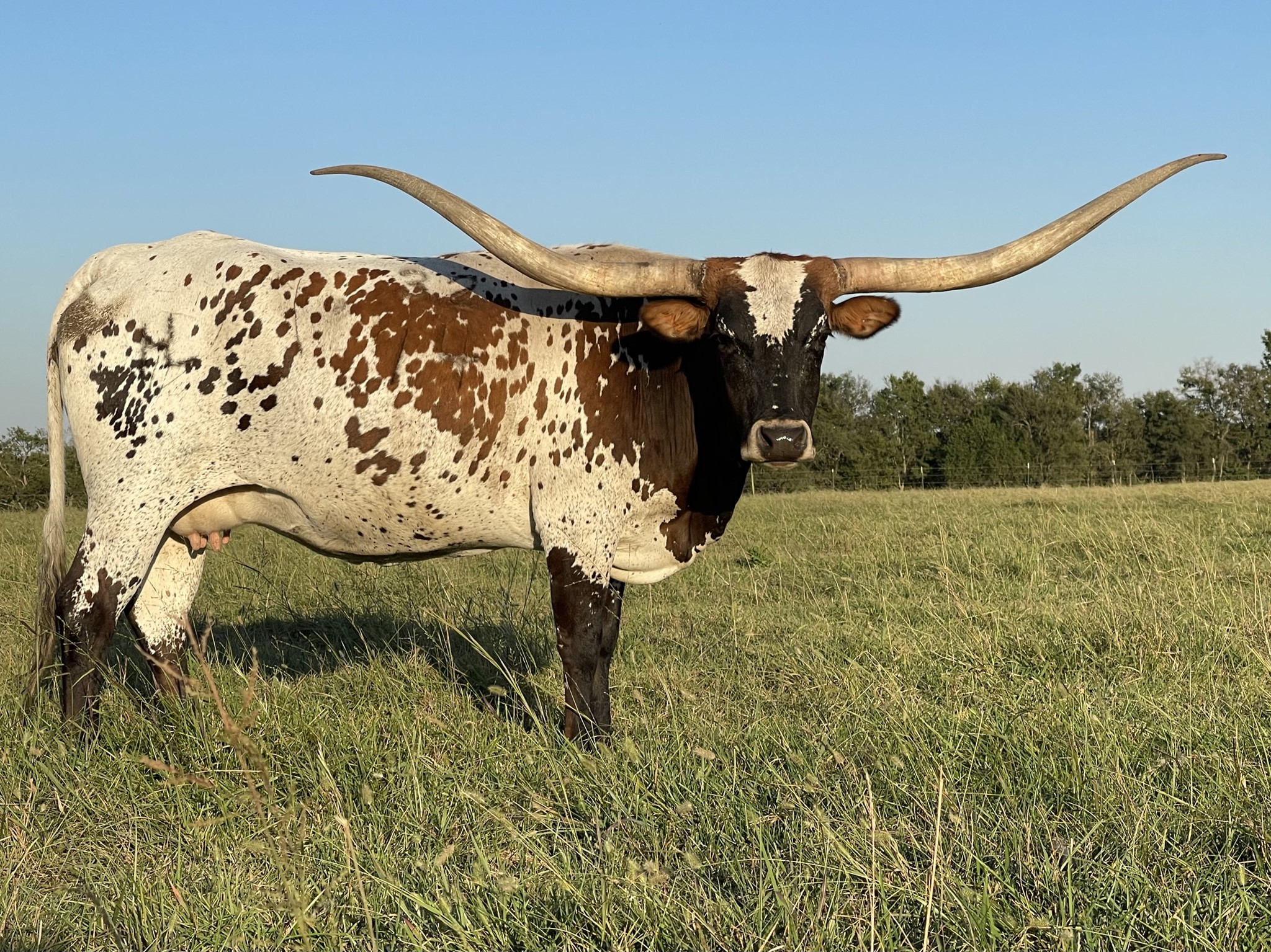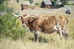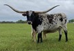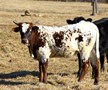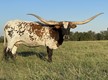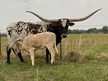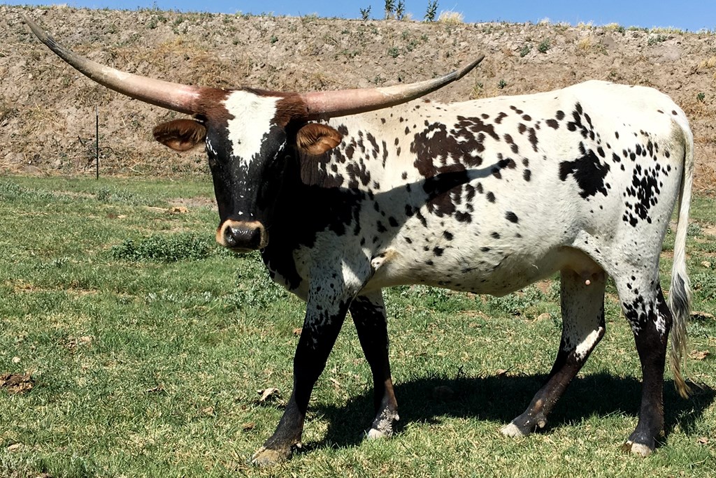 A very nice Fox Chex heifer that we purchased at the 2015 Rocky Mtn Select Sale from Hudson Longhorns. She is very long and tall. Even though her horns are up they are super back and will roll and twist nicely!