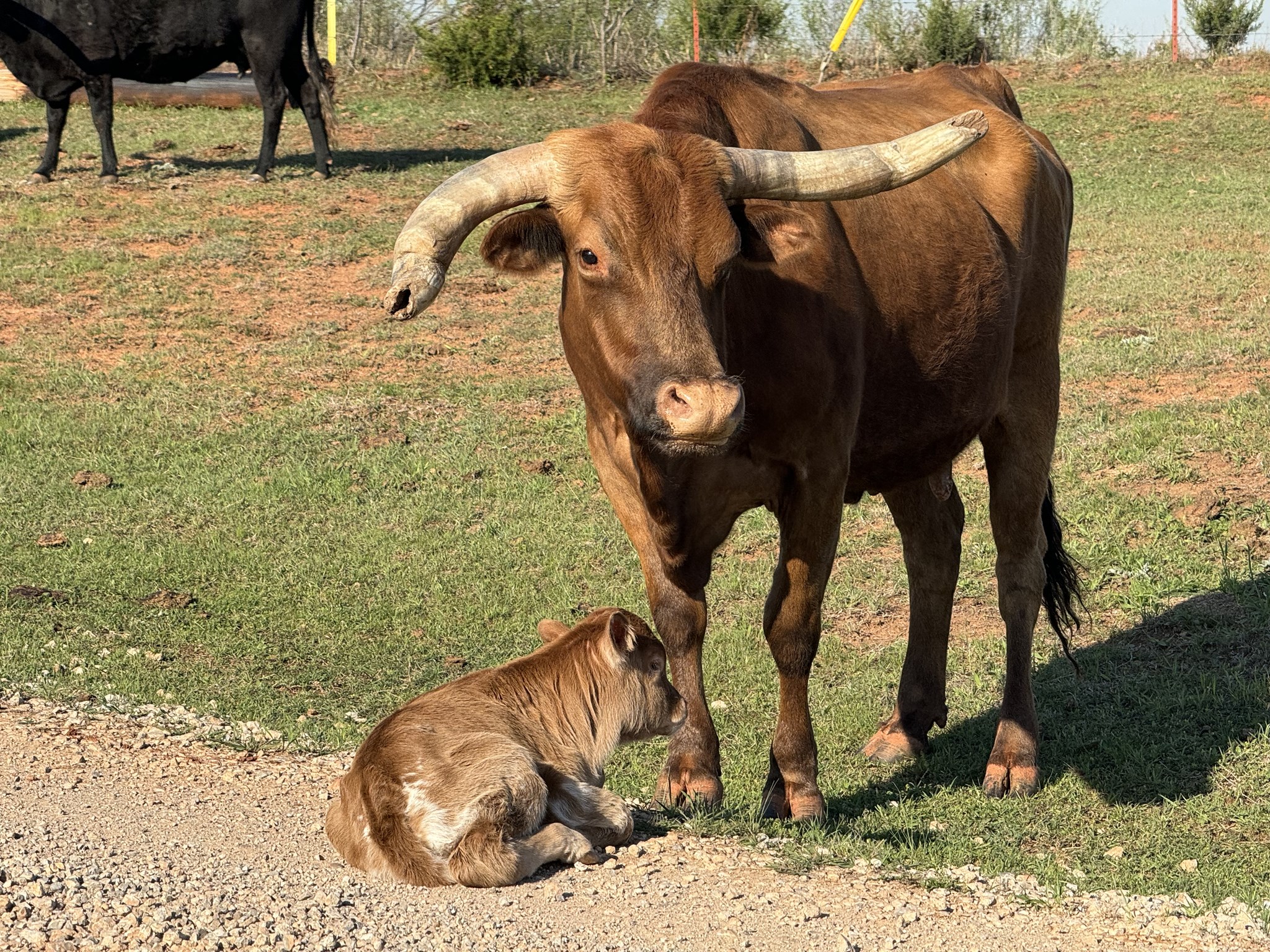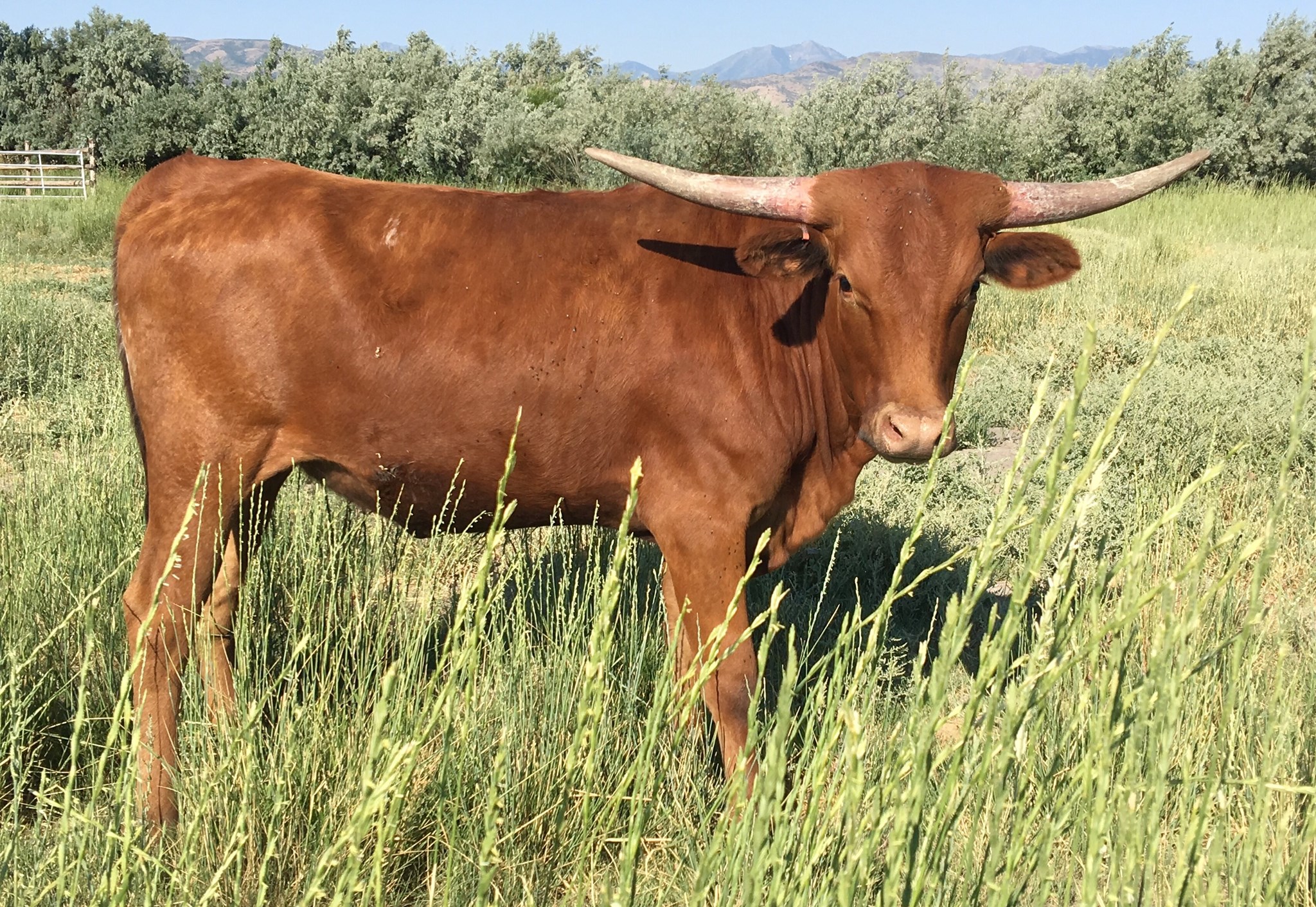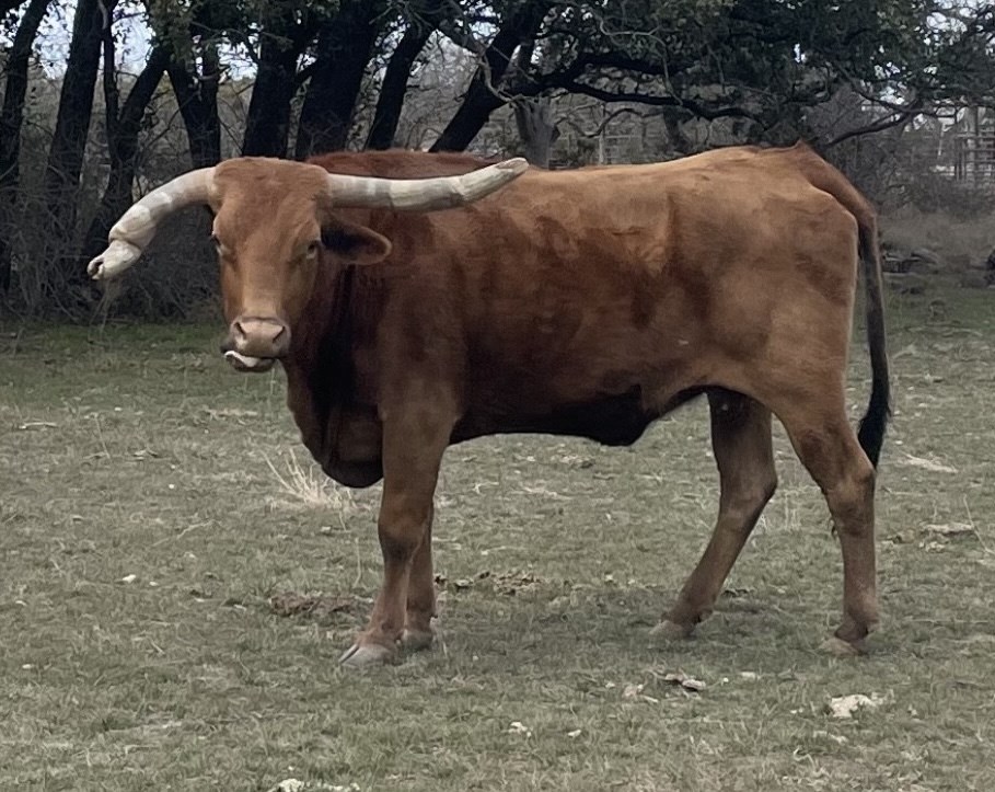 One of our favorite cows on the farm. Deep rich history of survival with this sweet but strong cow. She's built very well with a very stout frame that sits on some thick boned legs. She's the grandmother of the 95" true black bull named Dark Dust. Her 2025 bull calf out of Goose is probably the biggest bodied calf coming out of a cow that I have seen in a longhorn and we're keeping an eye on him...he's looking great. Super cow that is here to stay and is the backbone and heart of this farm.